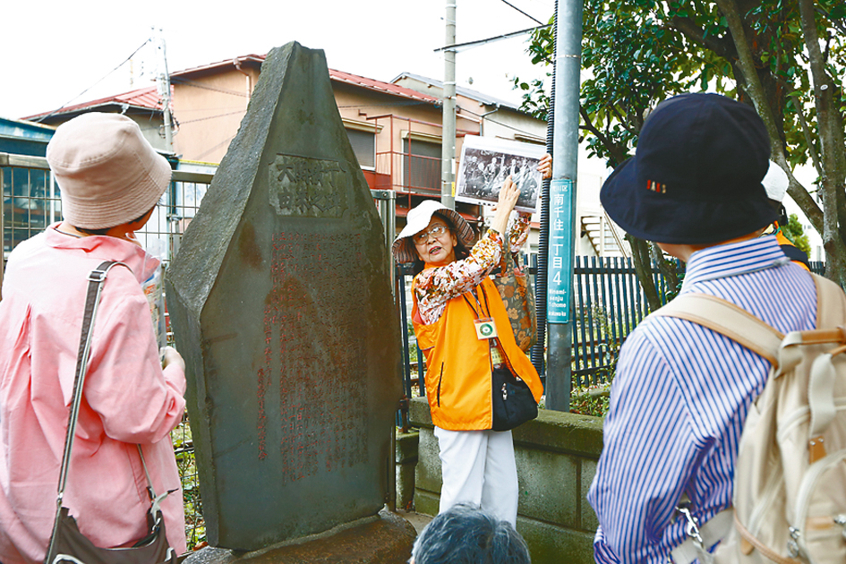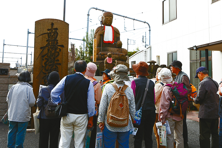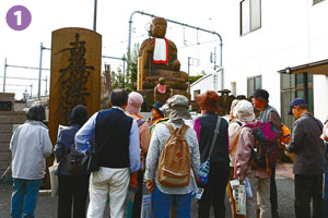 JR南千住駅をスタートし、観光ボランティアガイドの案内で参加者が最初に向かったのは、延命寺と回向院です。いずれも江戸時代のお仕置き場であった小塚原刑場の跡地に建つ寺院。延命寺では罪人たちの供養のために造立された首切地蔵❶を、回向院では蘭学医である杉田玄白の観臓記念碑❷などを拝観しました。「玄白らはここで刑死者の腑分け(解剖)に立ち会い、『解体新書』の翻訳を決意したといわれます。そのため、日本の近代医学発祥の地といえますね」とガイドさんの詳細な解説に、参加者のなかにはメモを取る姿もありました。
