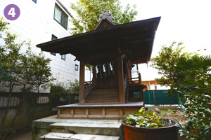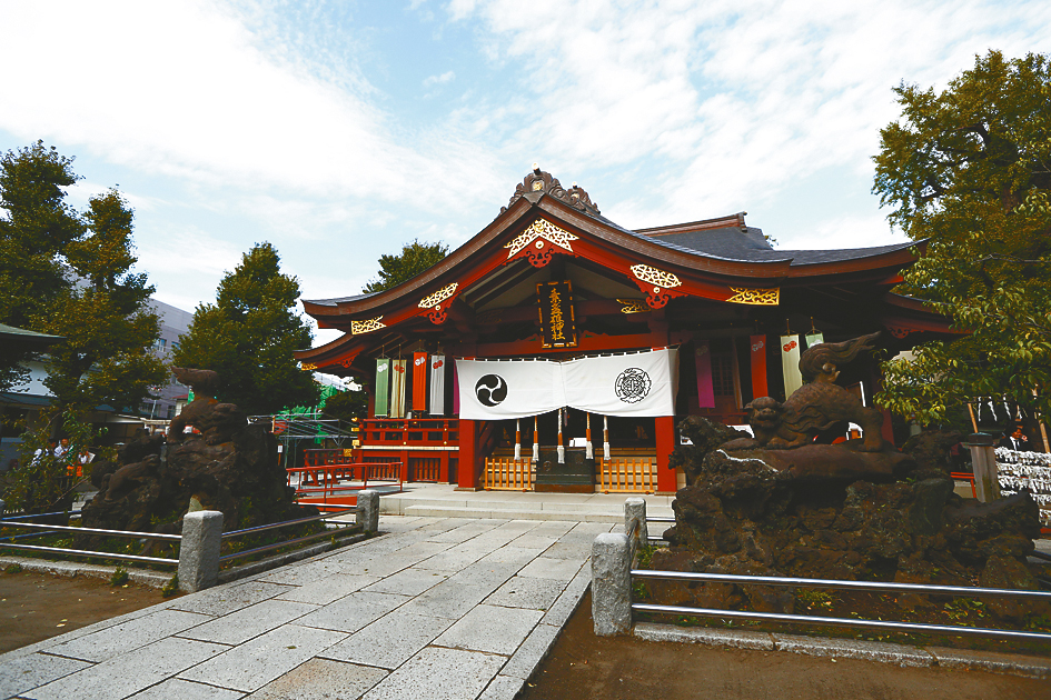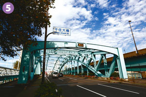 次に一行が向かったのは千住大橋にほど近い熊野神社❹。一五九四年に千住大橋が完成した際に橋の残材で社殿が修理され、以後、橋の架け替えごとに橋の完成祈願と社殿修理が慣例になったといわれます。ガイドさんからは「荒川(現・隅田川)は、その名の通り〝荒ぶる川〟でしたので、架橋はとても大変でした」と、現在とは違う川や橋の様相が語られました。