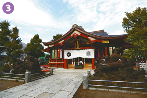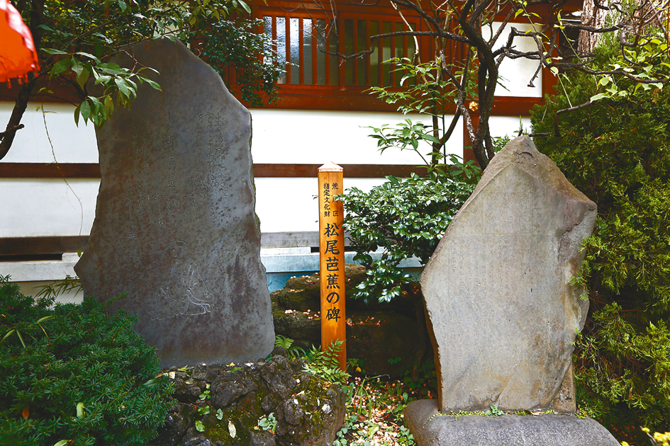 情緒あふれるコツ通りを歩き、一行が到着したのは素盞雄(すさのお)神社❸。七九五年に創建された霊験あらたかな古社の境内には、「奥の細道矢立初めの句碑」が建ちます。石碑に刻まれた「行く春や鳥啼魚の目は泪」の句に、芭蕉は見送りの人々と別れ旅立つ気持ちを込め、『おくのほそ道』の終着地である大垣(岐阜県)では「蛤のふたみに別れ行く秋ぞ」と、また新たな旅立ちに向けた思いを詠みました。