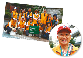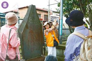 最後は商店街「ジョイフル三の輪」あたりをめぐりました。このあたりは大名の名前が地名として残る場所。大関屋敷付近❽でガイドさんは大関横町の由来となった黒羽藩主大関増業(ますなり)・増裕(ますひろ)を紹介し、増裕の写真を手に「とっても男前でしょ!」と笑いを交えながら、参加者を楽しませていました。参加者からは「こういった街の歴史を子どもたちにも教えてあげたい」との言葉も聞かれ、未来へとつながる「千住まちあるきツアー」は幕を閉じました。